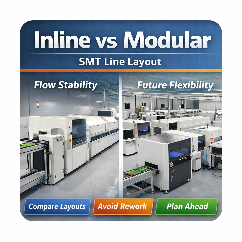 Inline raspored ističe se u stabilnim, velikim serijama s kontinuiranim protokom i brzim postavljanjem kao što su JUKI i Hanwha. Modularni raspored nudi bolju otpornost na promjene, visoku mješavinu niske količine i buduća proširenja uz lakšu integraciju ICT inspekcije i međuspremnika. Pravi izbor ovisi o miksu proizvoda, stabilnosti količine, planovima inspekcije i toleranciji budućih troškova promjena—ne samo o početnom prostoru ili cijeni. Upotrijebite kontrolni popis od 5 točaka kako biste uskladili svoju stvarnu situaciju i izbjegli kasnije skupe prerade.
